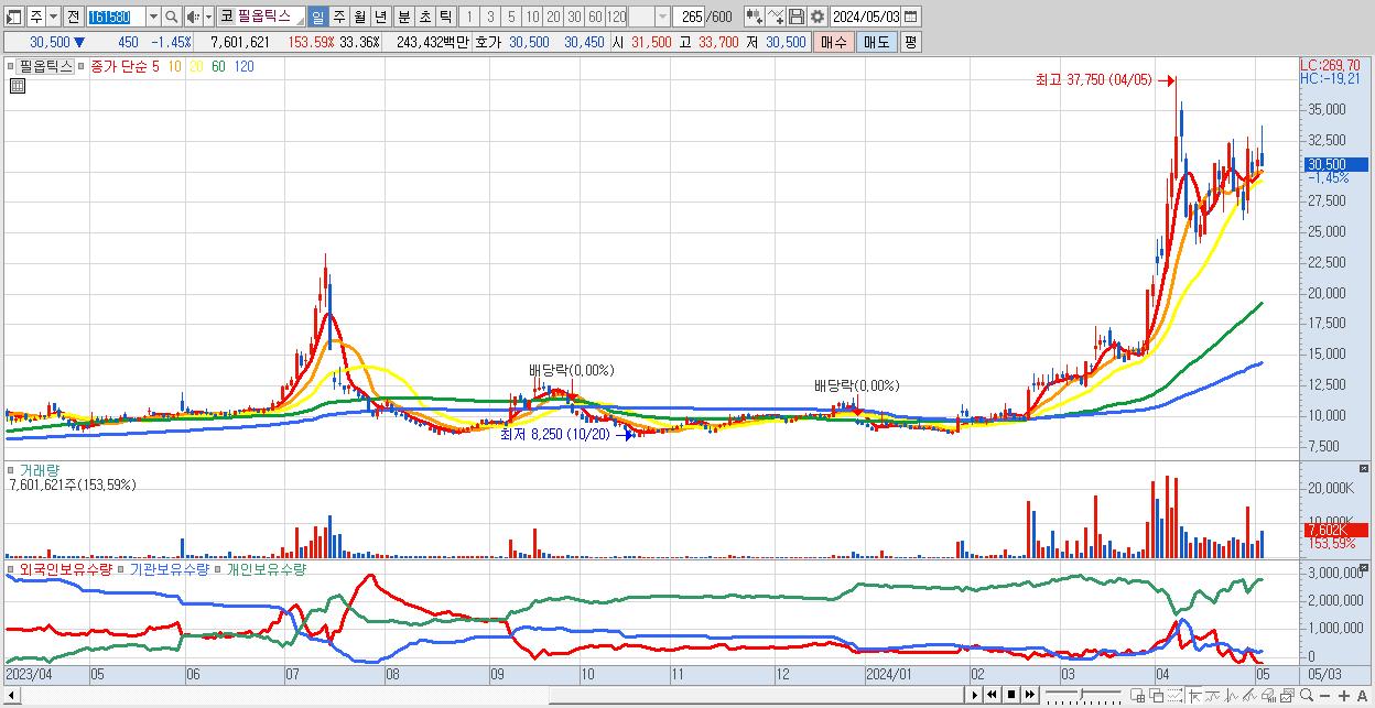 - 필옵틱스 (30,500원 ▼ -1.45% , 시총: 6,950억, 거래량: 7,601,621, 거래대금:2,434억)