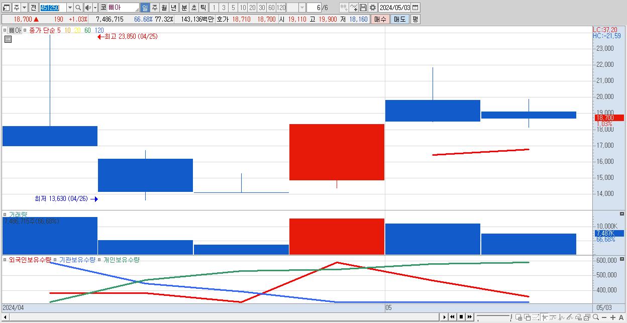 - 삐아 (18,700원 ▲ 1.03% , 시총: 1,811억, 거래량: 7,486,715, 거래대금:1,431억)