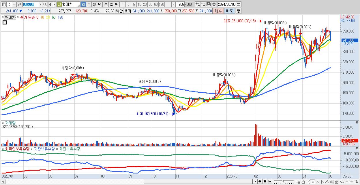- 현대차 (241,000원 ▼ -3.21% , 시총: 504,693억, 거래량: 727,057, 거래대금:1,777억)