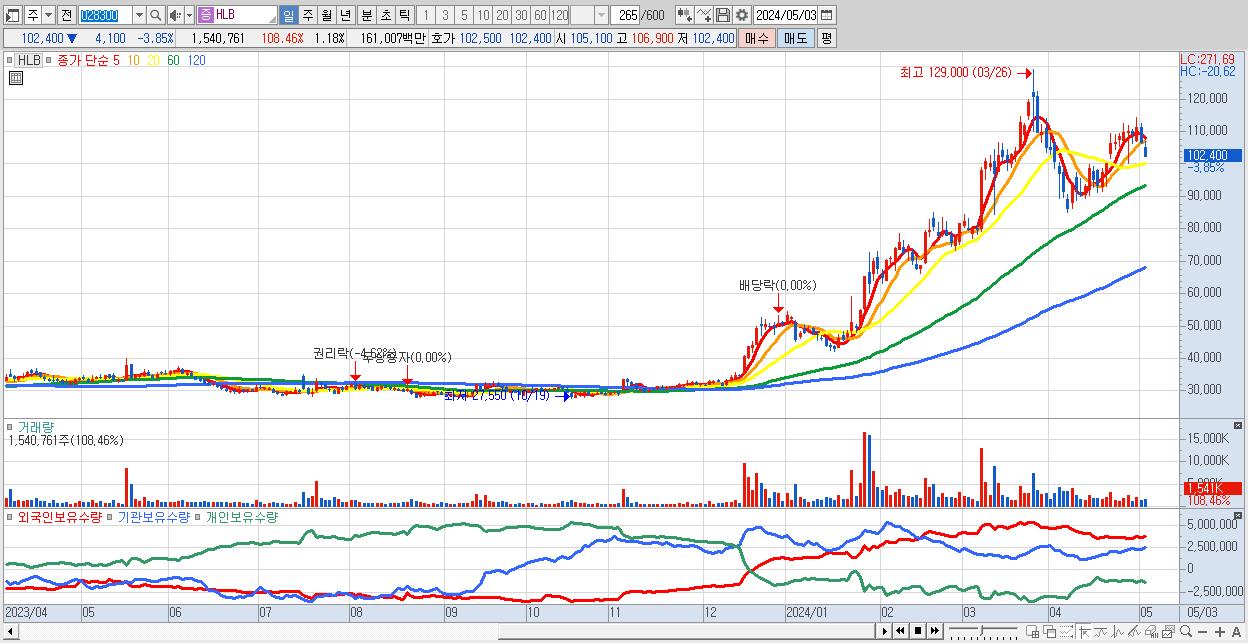 - HLB (102,400원 ▼ -3.85% , 시총: 133,970억, 거래량: 1,540,761, 거래대금:1,610억)