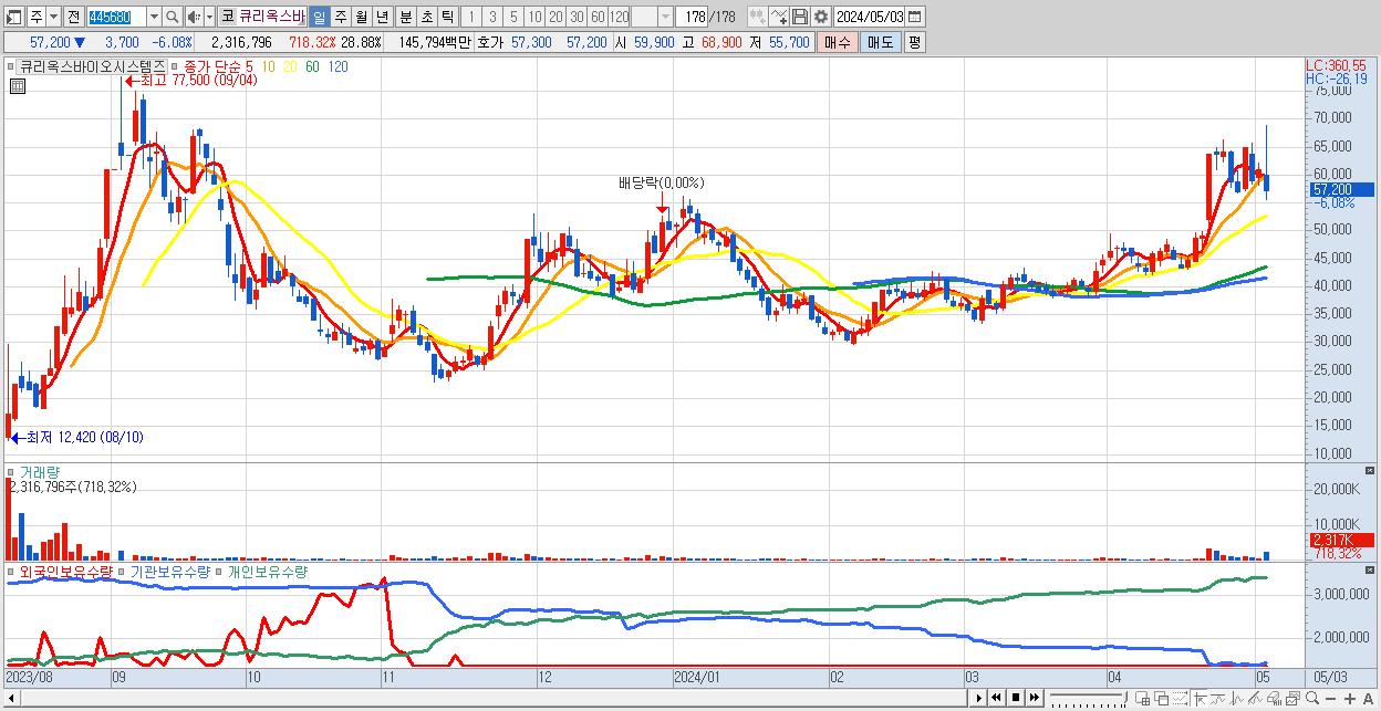 - 큐리옥스바이오시스템즈 (57,200원 ▼ -6.08% , 시총: 4,589억, 거래량: 2,316,796, 거래대금:1,458억)