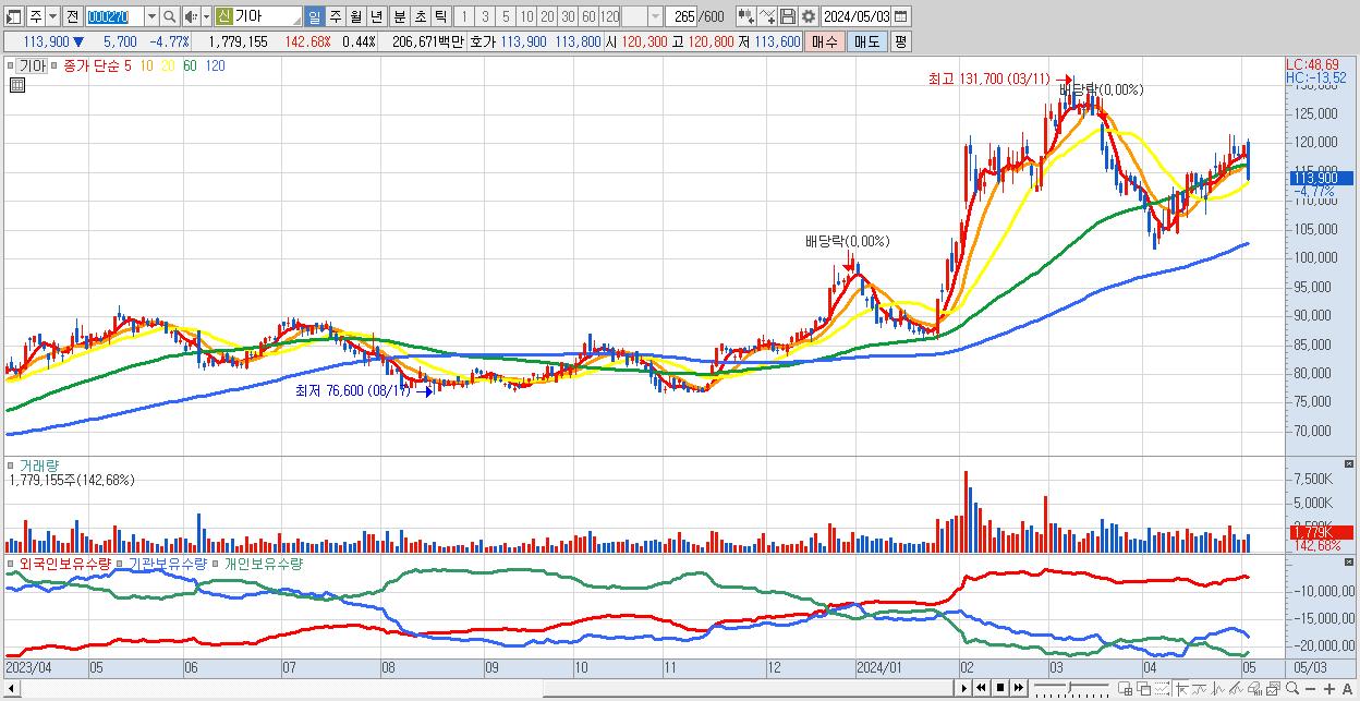 - 기아 (113,900원 ▼ -4.77% , 시총: 457,928억, 거래량: 1,779,155, 거래대금:2,067억)