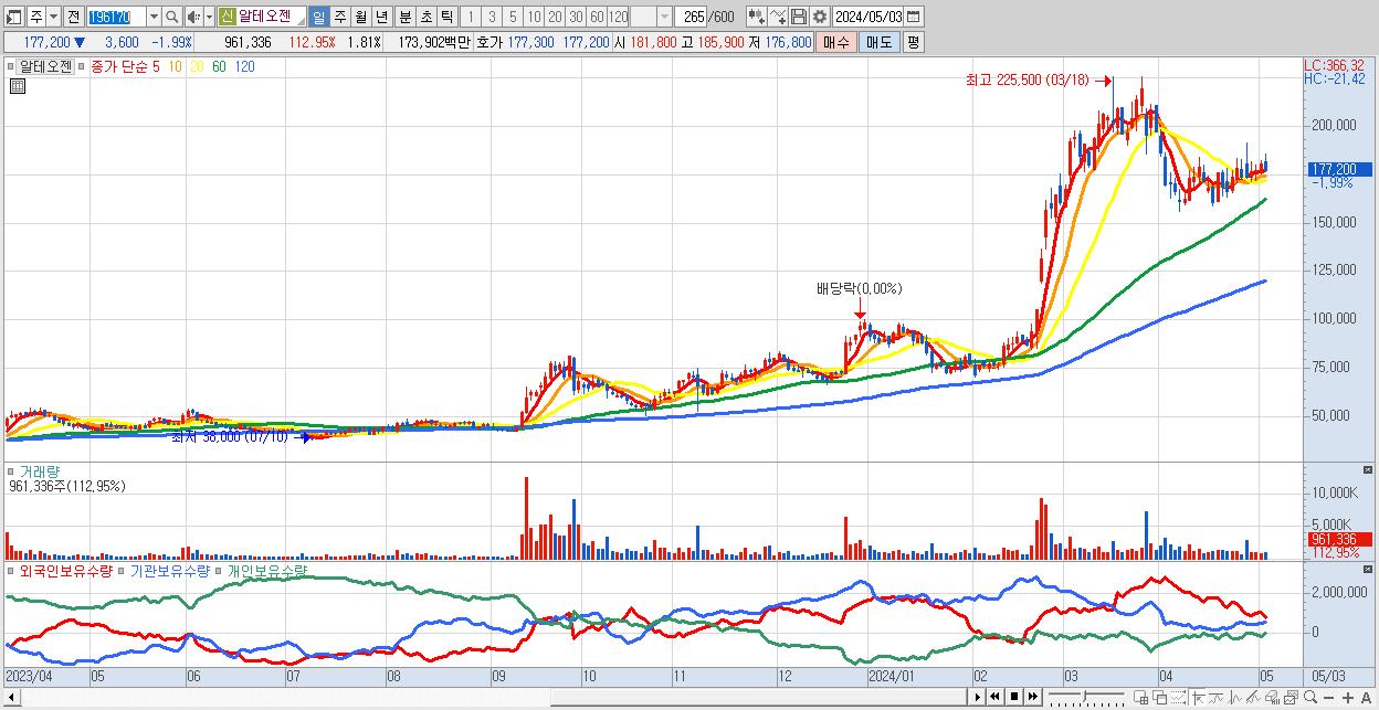 - 알테오젠 (177,200원 ▼ -1.99% , 시총: 93,937억, 거래량: 961,336, 거래대금:1,739억)