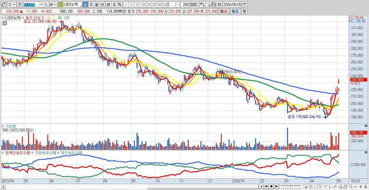 - LG이노텍 (234,500원 ▲ 4.92% , 시총: 55,499억, 거래량: 508,130, 거래대금:1,191억)