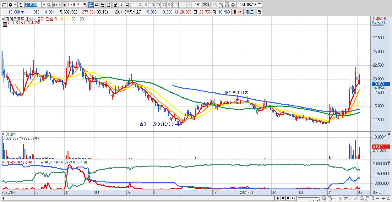 - 마이크로투나노 (19,060원 ▼ -4.08% , 시총: 1,128억, 거래량: 5,632,062, 거래대금:1,231억)