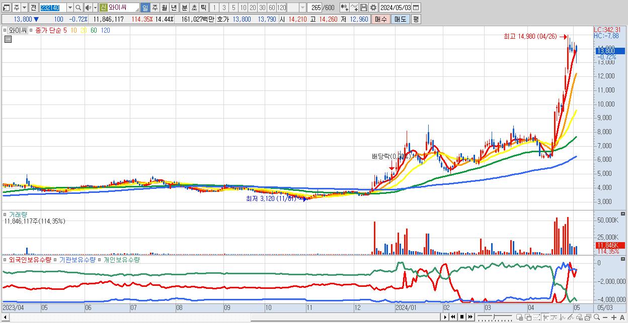 - 와이씨 (13,800원 ▼ -0.72% , 시총: 11,322억, 거래량: 11,846,117, 거래대금:1,610억)