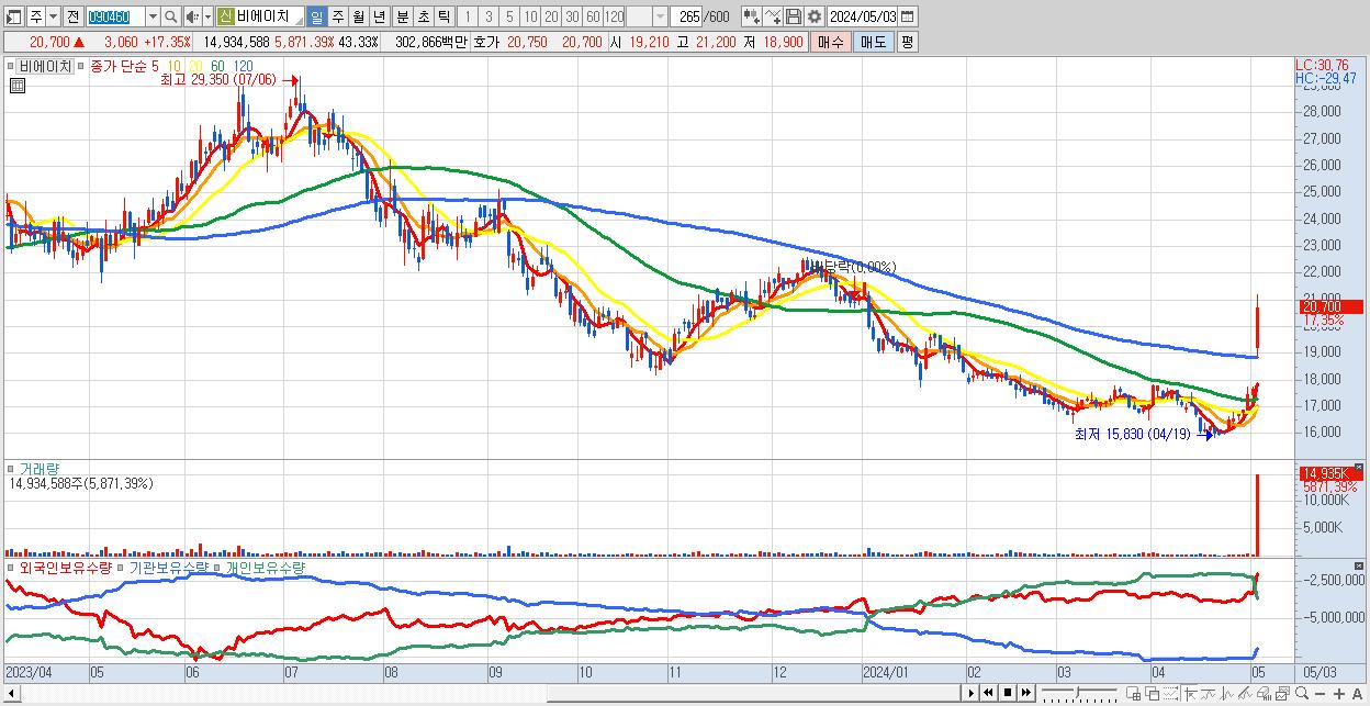 - 비에이치 (20,700원 ▲ 17.35% , 시총: 7,134억, 거래량: 14,934,588, 거래대금:3,029억)