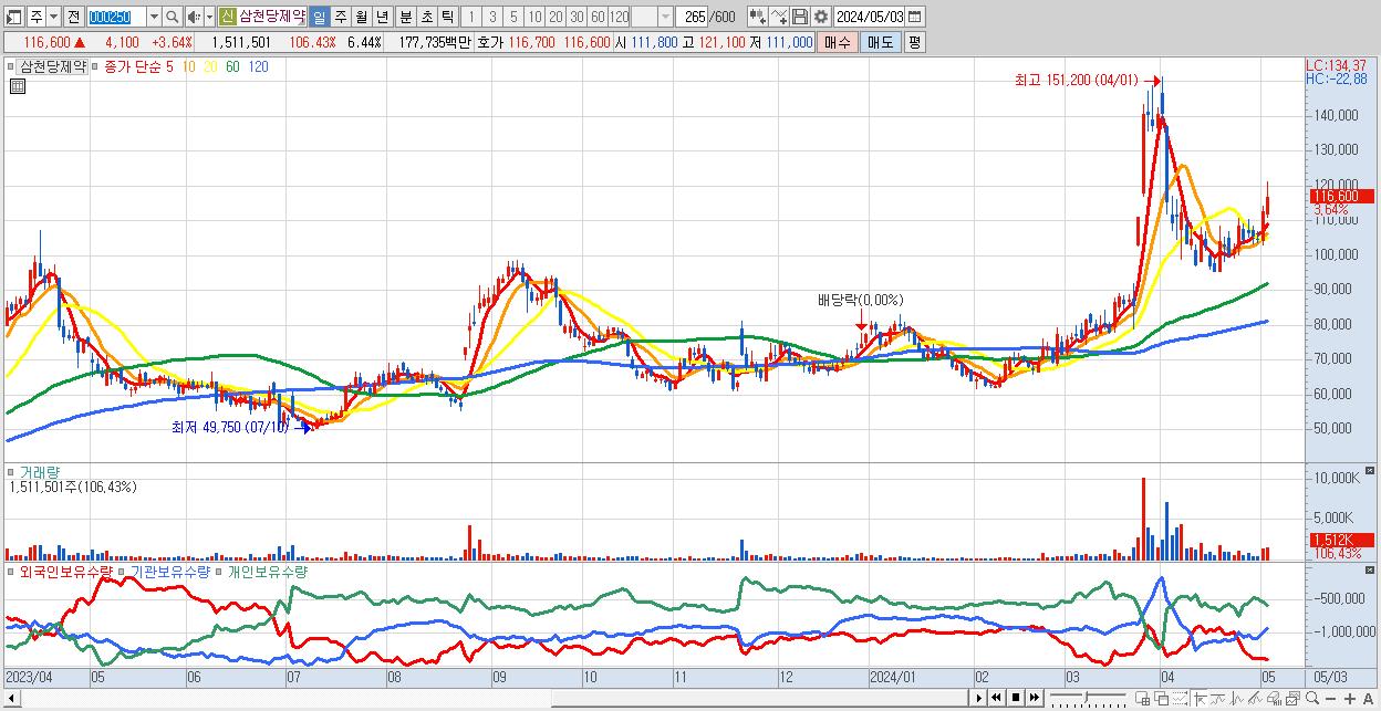 - 삼천당제약 (116,600원 ▲ 3.64% , 시총: 27,351억, 거래량: 1,511,501, 거래대금:1,777억)