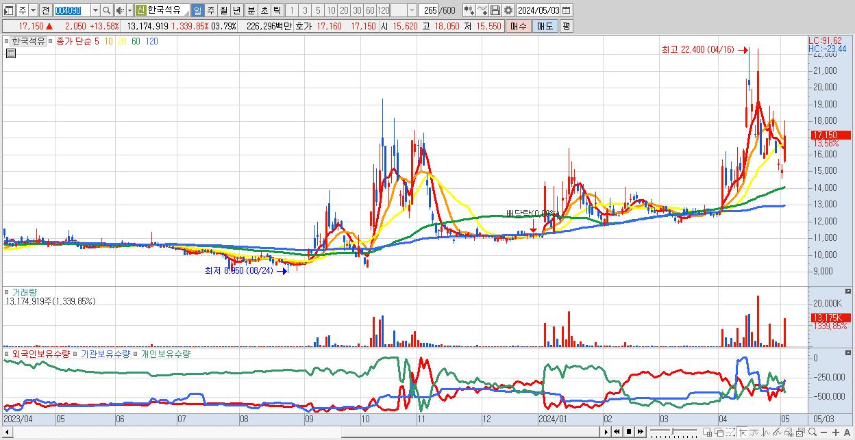 - 한국석유 (17,150원 ▲ 13.58% , 시총: 2,177억, 거래량: 13,174,919, 거래대금:2,263억)