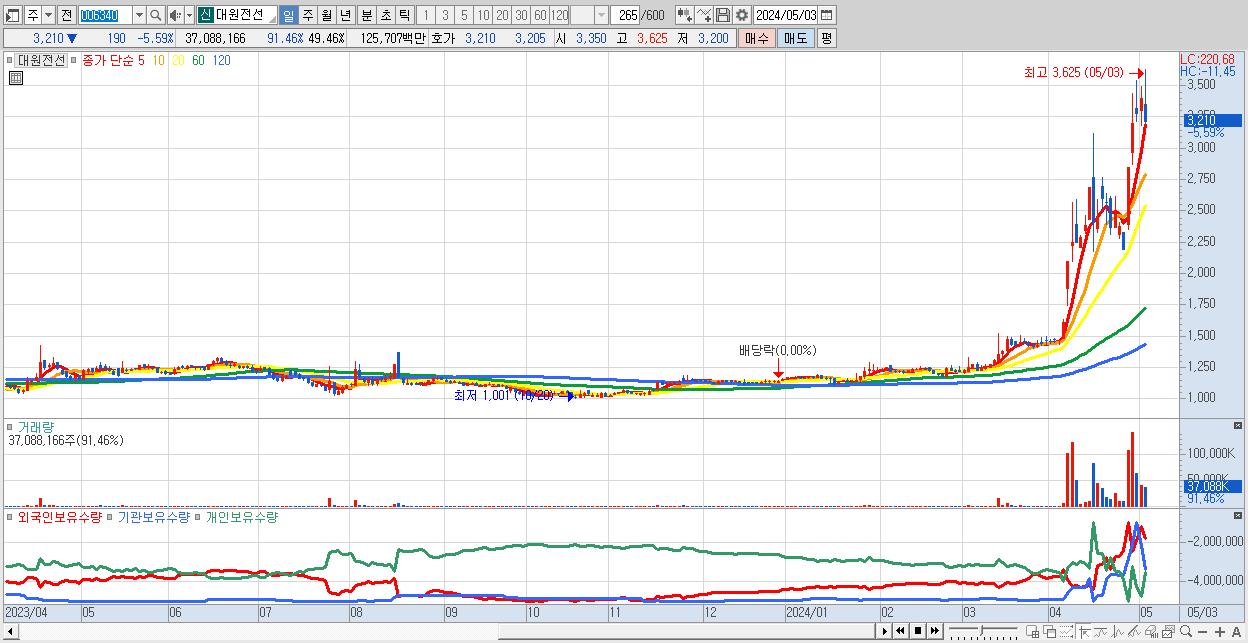 - 대원전선 (3,210원 ▼ -5.59% , 시총: 2,407억, 거래량: 37,088,166, 거래대금:1,257억)