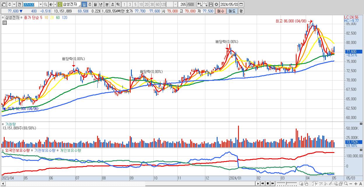 1.삼성전자 77,600원 ▼ -0.51% (KOSPI, 005930)