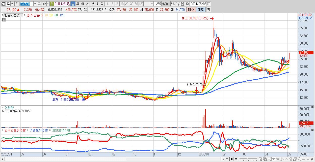 - 한글과컴퓨터 (27,100원 ▲ 9.49% , 시총: 6,553억, 거래량: 6,570,839, 거래대금:1,718억)
