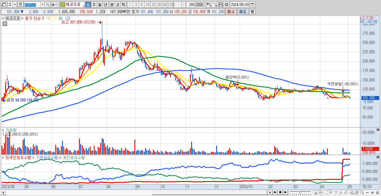 - 에코프로 (101,300원 ▼ -2.69% , 시총: 134,869억, 거래량: 1,626,095, 거래대금:1,679억)