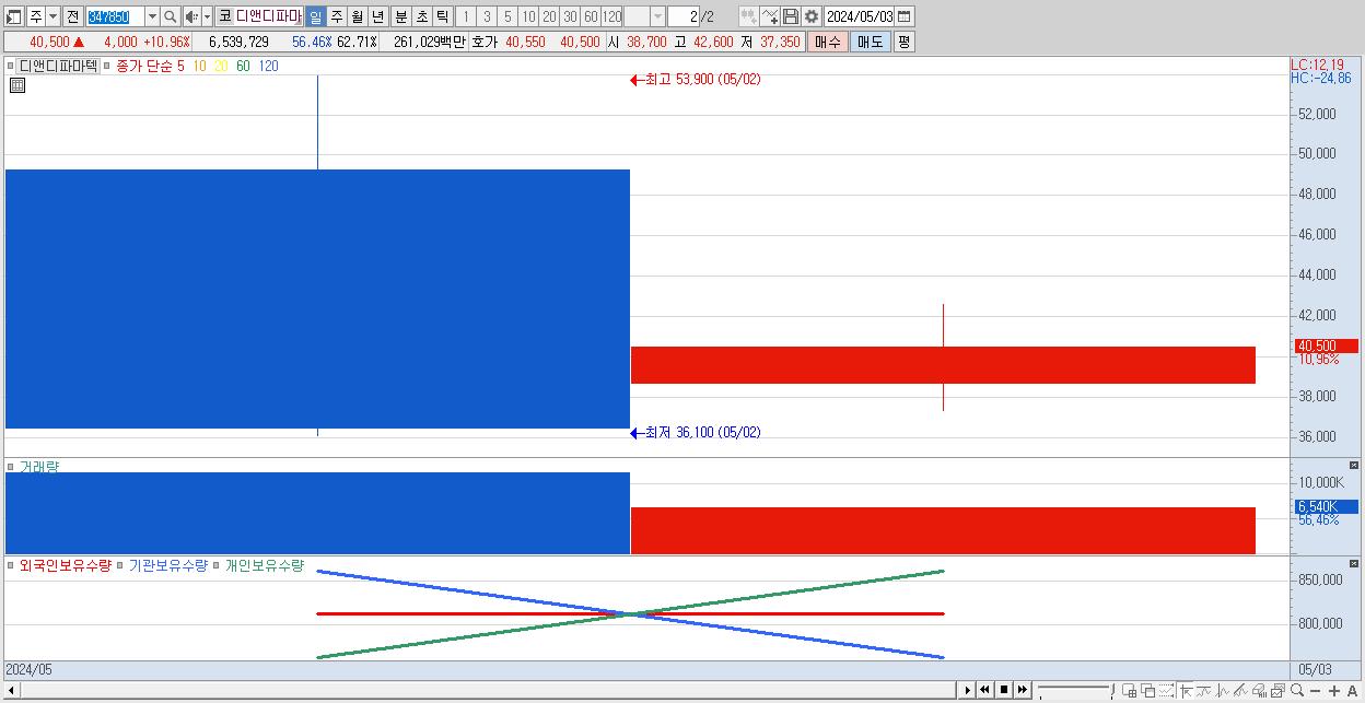- 디앤디파마텍 (40,500원 ▲ 10.96% , 시총: 4,224억, 거래량: 6,539,729, 거래대금:2,610억)