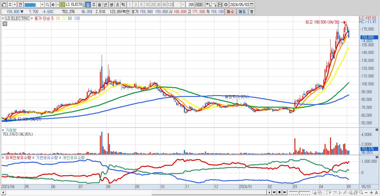 - LS ELECTRIC (159,800원 ▼ -4.6% , 시총: 47,940억, 거래량: 753,376, 거래대금:1,239억)