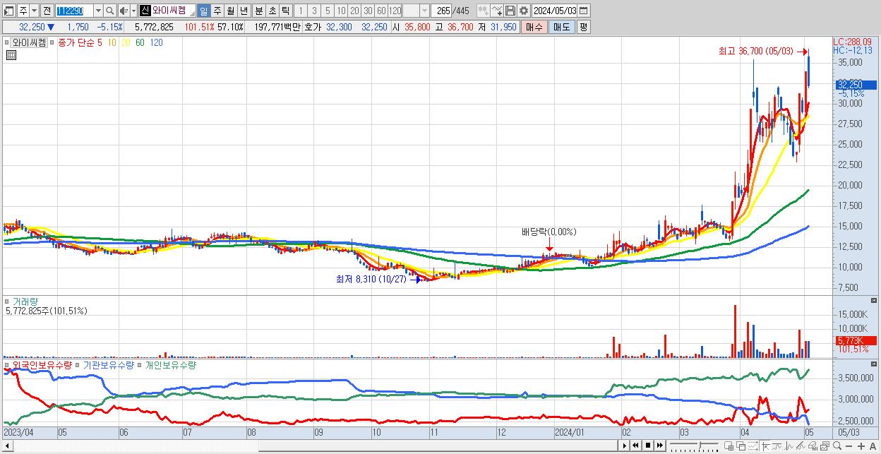 - 와이씨켐 (32,250원 ▼ -5.15% , 시총: 3,261억, 거래량: 5,772,825, 거래대금:1,978억)