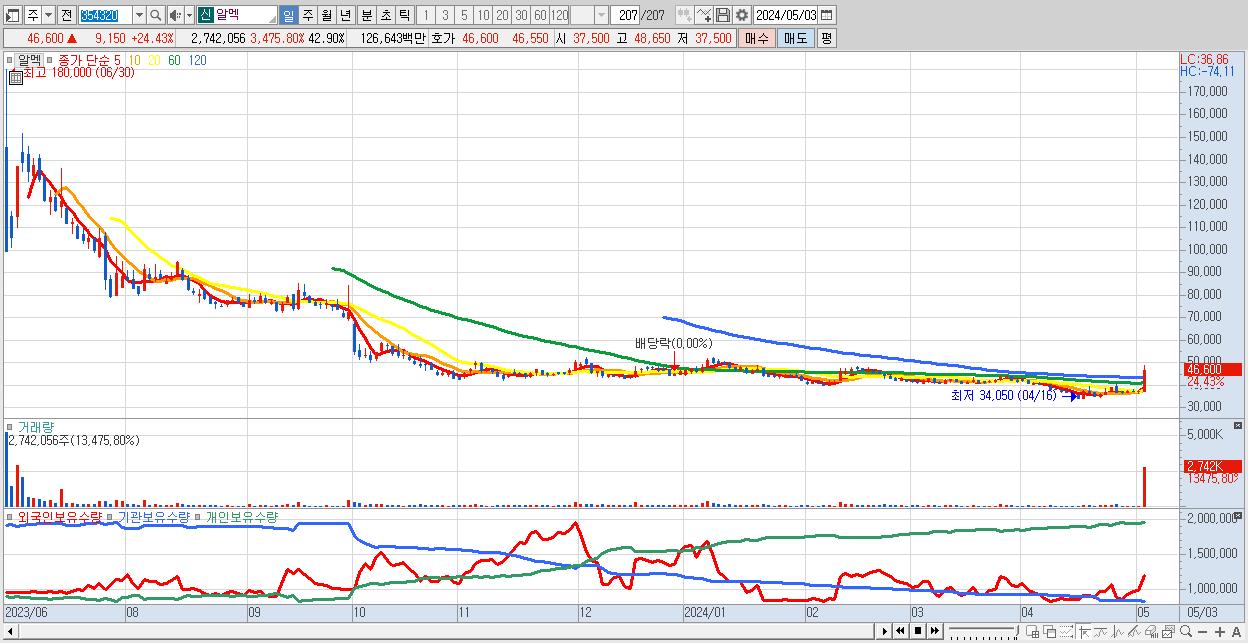 - 알멕 (46,600원 ▲ 24.43% , 시총: 2,978억, 거래량: 2,742,056, 거래대금:1,266억)