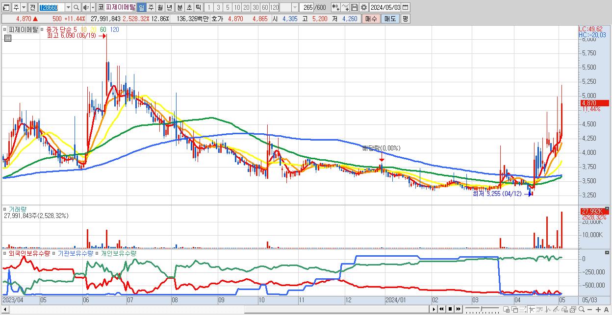 - 피제이메탈 (4,870원 ▲ 11.44% , 시총: 1,208억, 거래량: 27,991,843, 거래대금:1,363억)