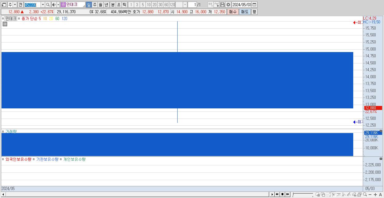 - 민테크 (12,880원 ▲ 22.67% , 시총: 2,827억, 거래량: 29,116,370, 거래대금:4,050억)
