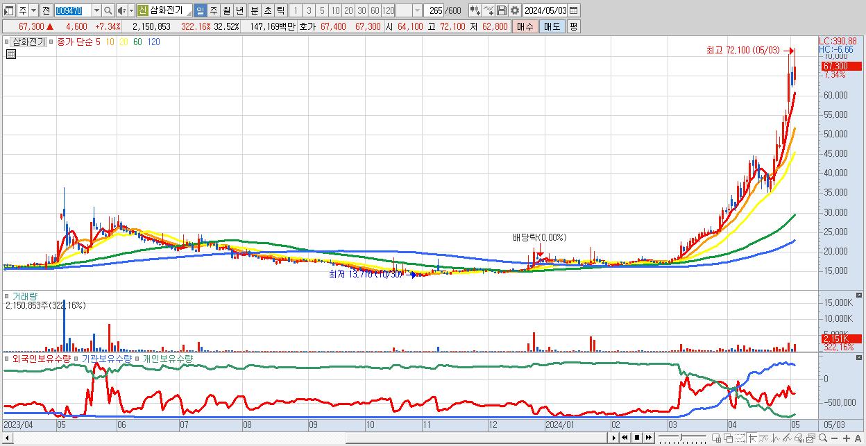 - 삼화전기 (67,300원 ▲ 7.34% , 시총: 4,451억, 거래량: 2,150,853, 거래대금:1,472억)