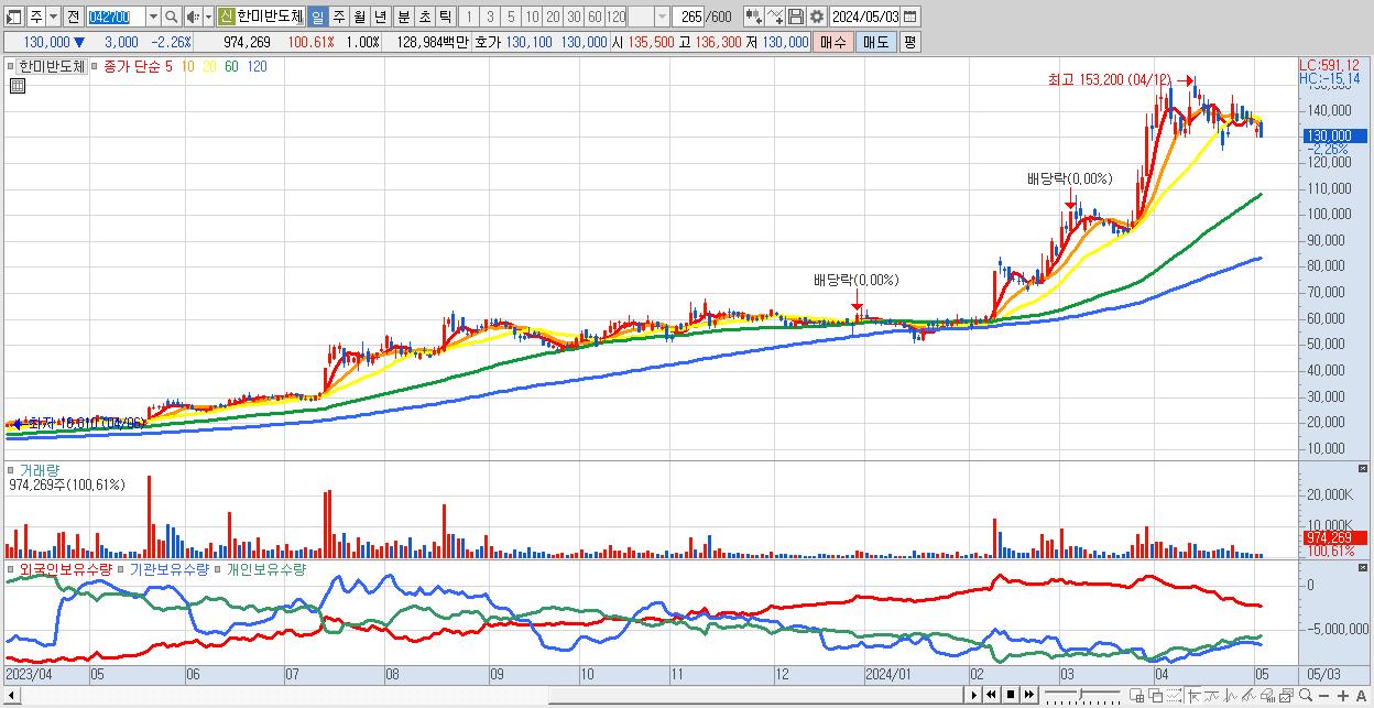 - 한미반도체 (130,000원 ▼ -2.26% , 시총: 126,541억, 거래량: 974,269, 거래대금:1,290억)