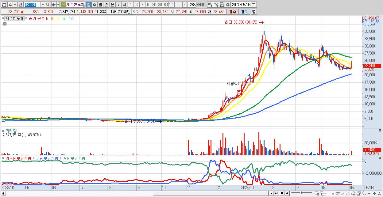 - 제주반도체 (23,200원 ▲ 3.8% , 시총: 7,991억, 거래량: 7,347,751, 거래대금:1,762억)