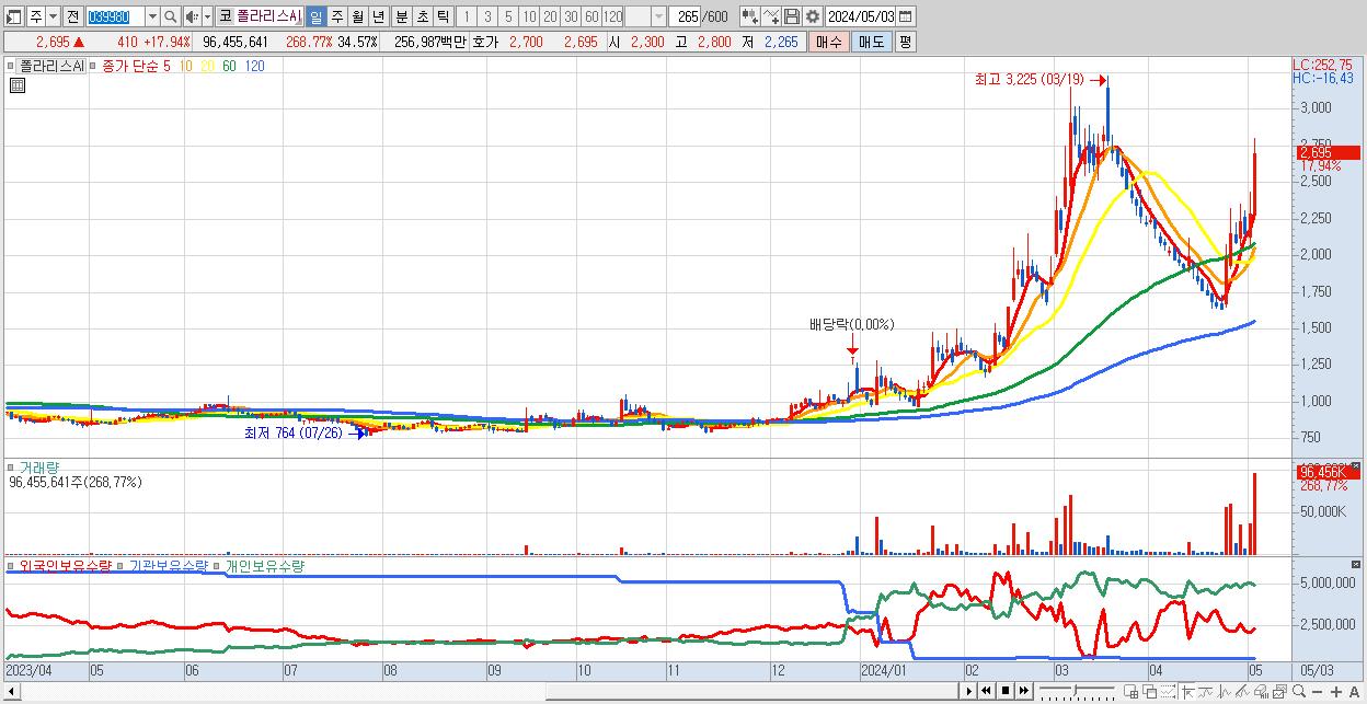 - 폴라리스AI (2,695원 ▲ 17.94% , 시총: 1,932억, 거래량: 96,455,641, 거래대금:2,570억)