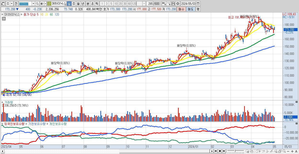 - SK하이닉스 (173,200원 ▼ -0.23% , 시총: 1,260,900억, 거래량: 2,336,256, 거래대금:4,088억)