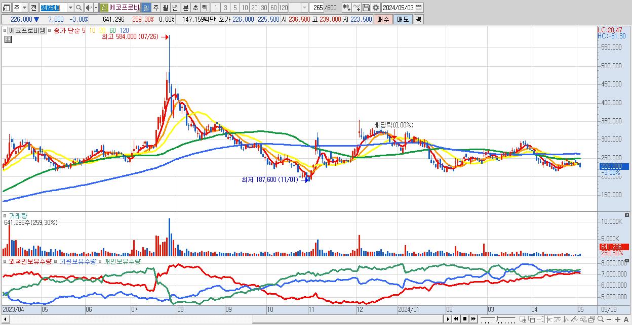 - 에코프로비엠 (226,000원 ▼ -3% , 시총: 221,031억, 거래량: 641,296, 거래대금:1,472억)