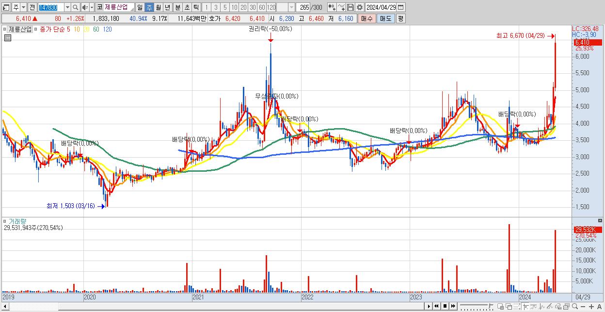 - 제룡산업 (6,410원 ▲ 25.93% , 시총: 1,282억, 거래량: 29,531,943, 거래대금:1,821억)