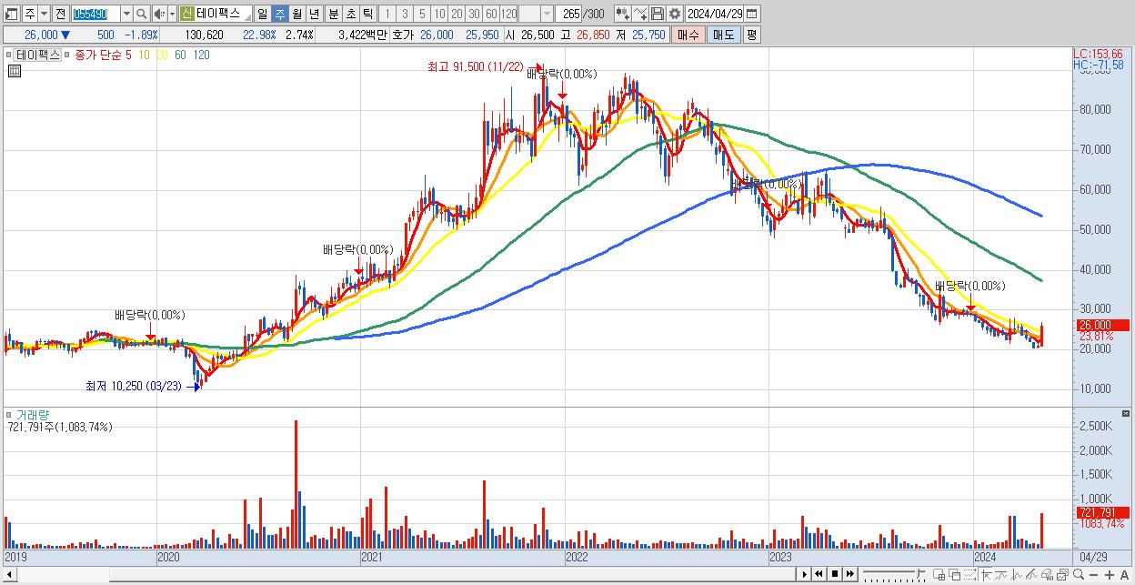 - 테이팩스 (26,000원 ▲ 23.81% , 시총: 1,239억, 거래량: 721,791, 거래대금:183억)