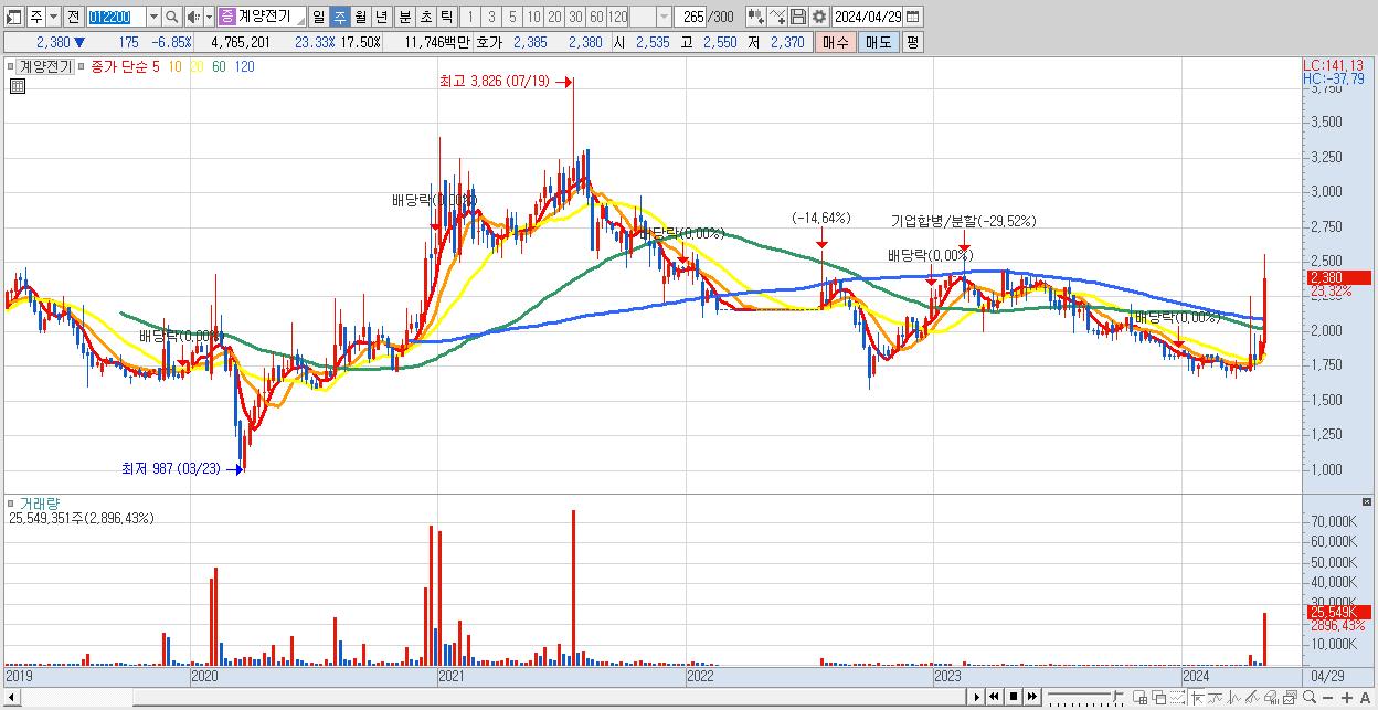 - 계양전기 (2,380원 ▲ 23.32% , 시총: 648억, 거래량: 25,549,351, 거래대금:629억)