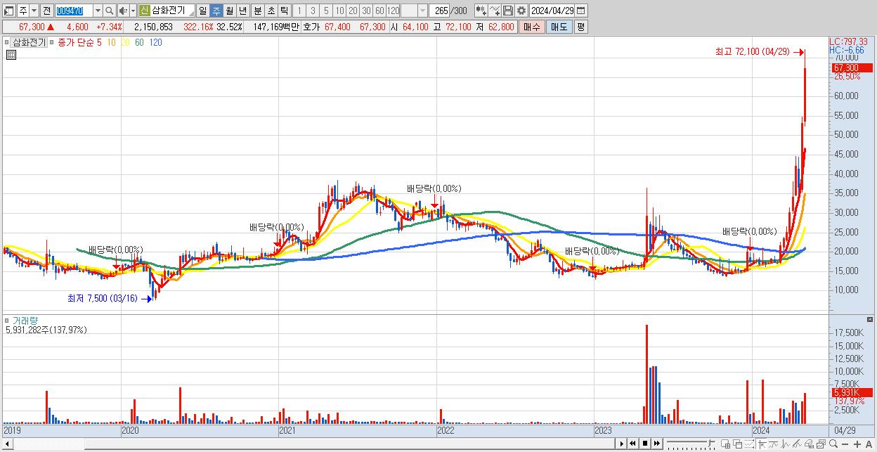 - 삼화전기 (67,300원 ▲ 26.5% , 시총: 4,451억, 거래량: 5,931,282, 거래대금:3,885억)