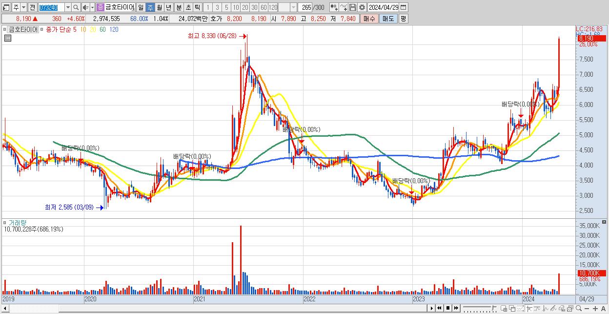 - 금호타이어 (8,190원 ▲ 26% , 시총: 23,527억, 거래량: 10,700,228, 거래대금:807억)