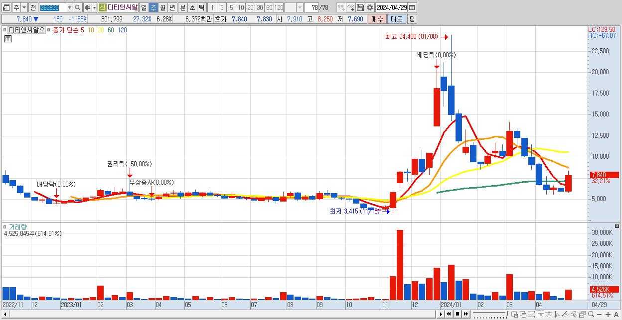 - 디티앤씨알오 (7,840원 ▲ 32.21% , 시총: 1,001억, 거래량: 4,525,845, 거래대금:346억)