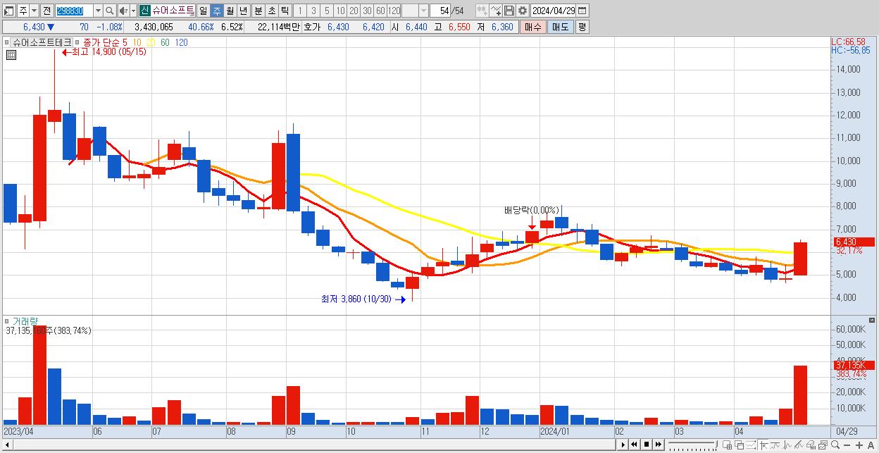 - 슈어소프트테크 (6,430원 ▲ 32.17% , 시총: 3,383억, 거래량: 37,135,160, 거래대금:2,294억)