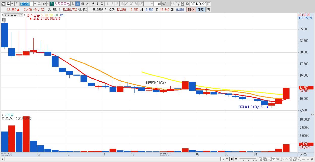 - 시지트로닉스 (12,350원 ▲ 23.5% , 시총: 557억, 거래량: 2,328,551, 거래대금:276억)