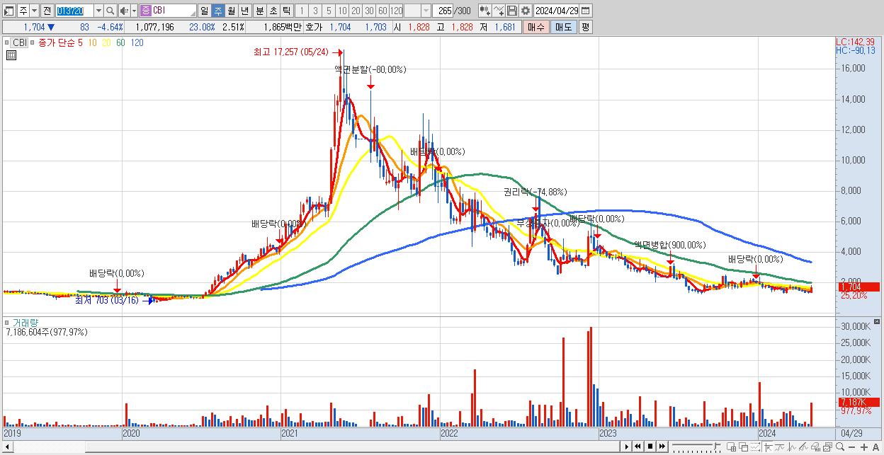 - CBI (1,704원 ▲ 25.2% , 시총: 730억, 거래량: 7,186,604, 거래대금:120억)