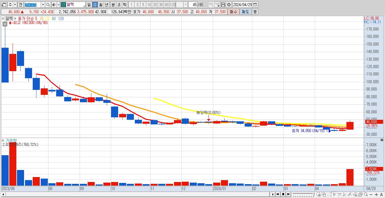 - 알멕 (46,600원 ▲ 26.98% , 시총: 2,978억, 거래량: 2,823,539, 거래대금:1,297억)