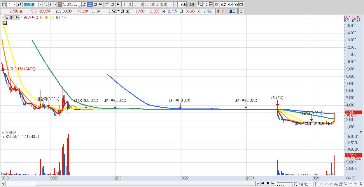 - 딥마인드 (2,985원 ▲ 75.69% , 시총: 682억, 거래량: 7,726,376, 거래대금:177억)
