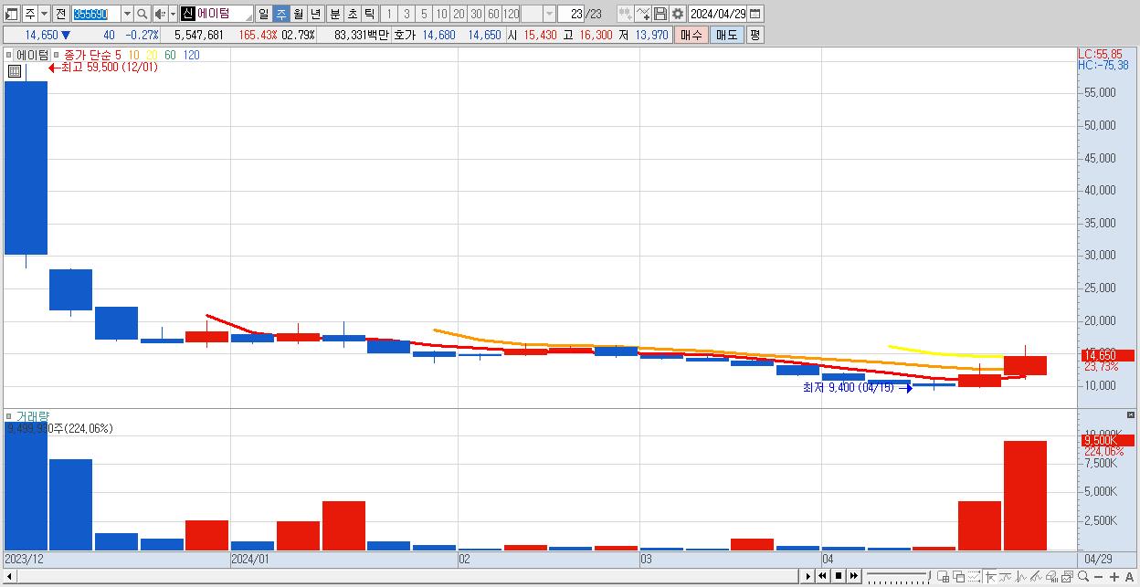 - 에이텀 (14,650원 ▲ 23.73% , 시총: 791억, 거래량: 9,499,930, 거래대금:1,352억)