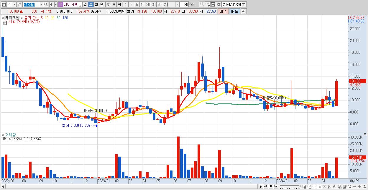 - 레이저쎌 (13,180원 ▲ 47.92% , 시총: 1,148억, 거래량: 15,140,822, 거래대금:1,866억)
