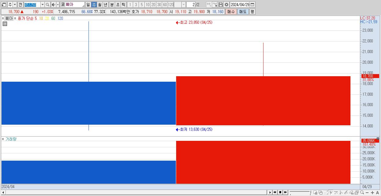 - 삐아 (18,700원 ▲ 31.88% , 시총: 1,811억, 거래량: 35,095,676, 거래대금:6,364억)