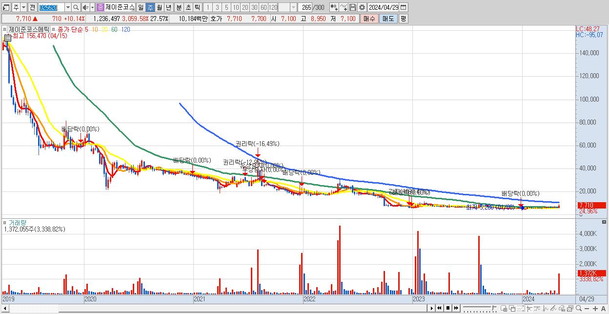 - 제이준코스메틱 (7,710원 ▲ 24.96% , 시총: 346억, 거래량: 1,372,055, 거래대금:111억)