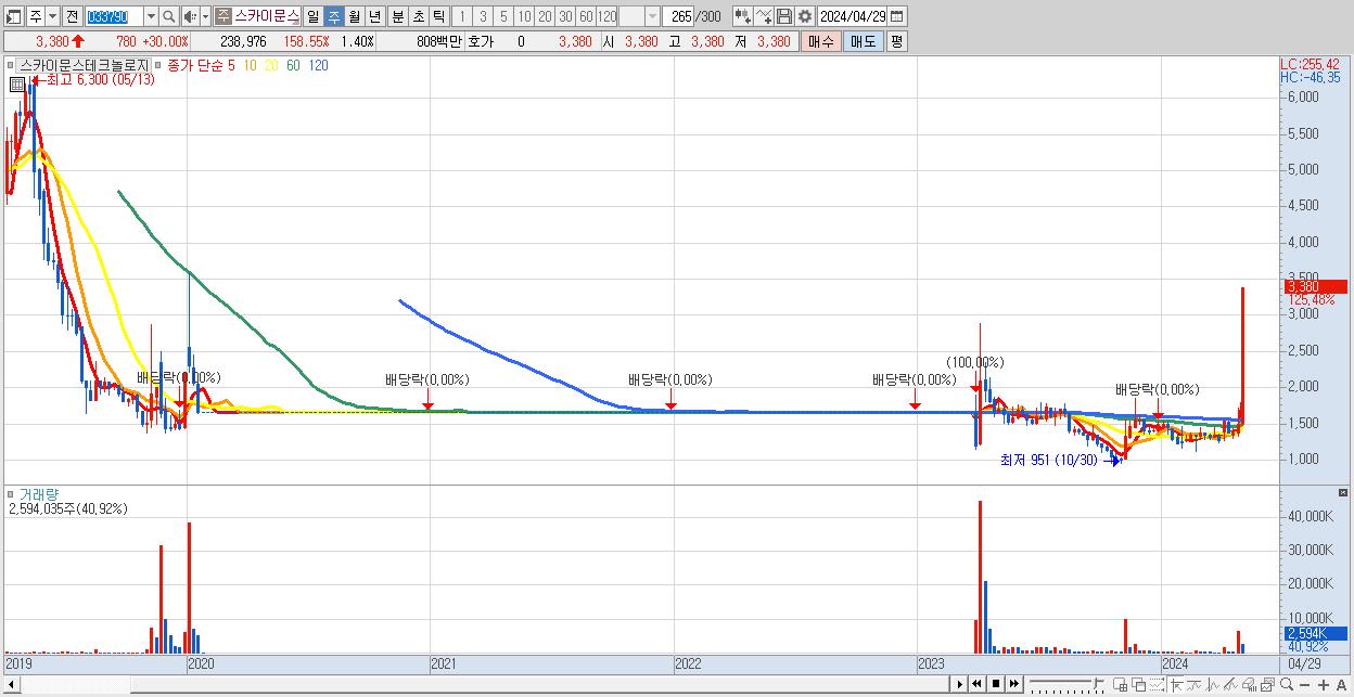 1.스카이문스테크놀로지 3,380원 ▲ 125.48% (KOSDAQ, 033790)