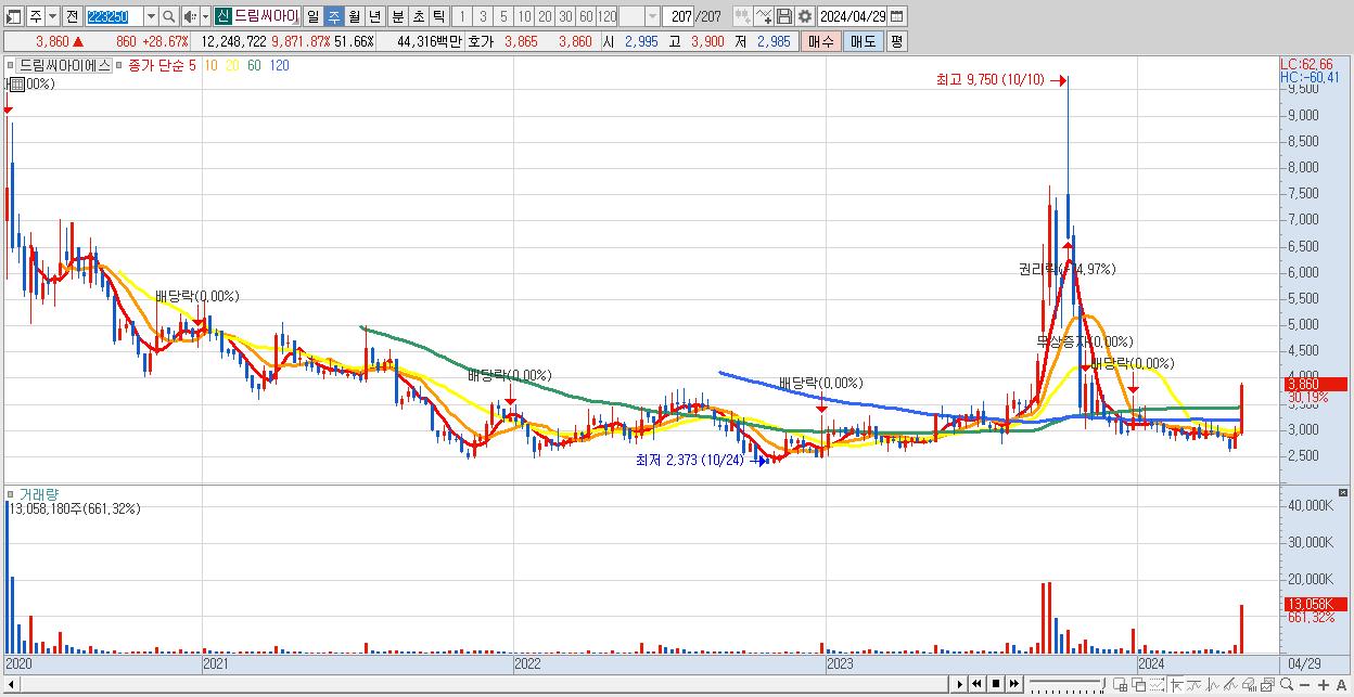 - 드림씨아이에스 (3,860원 ▲ 30.19% , 시총: 915억, 거래량: 13,058,180, 거래대금:468억)