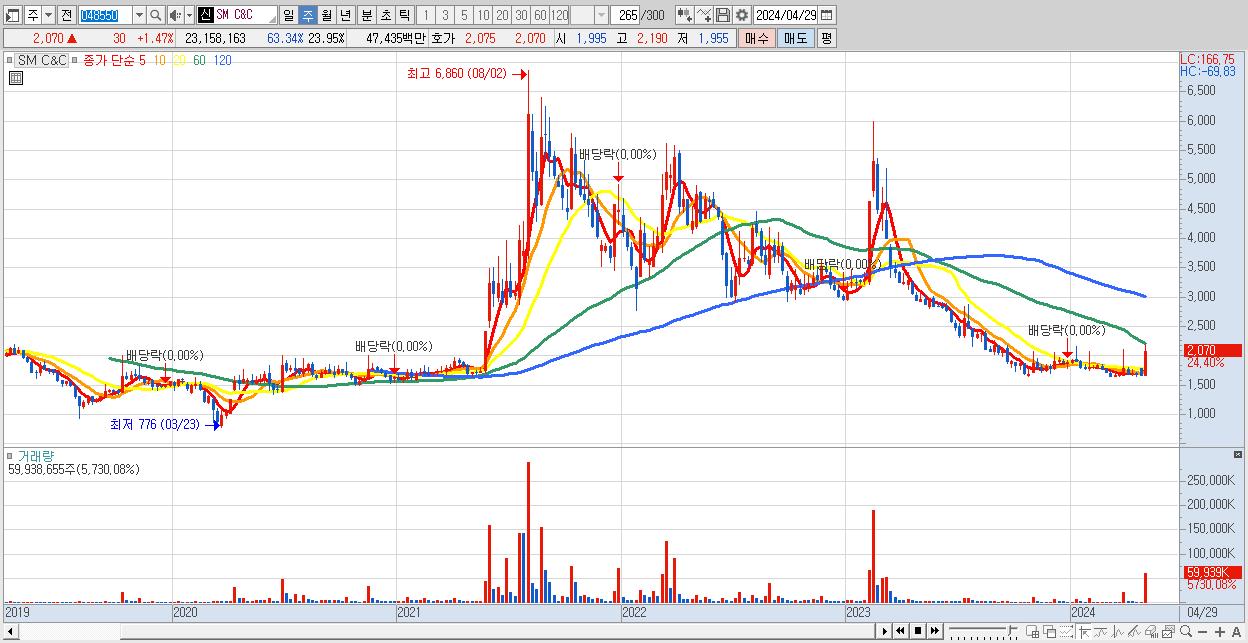- SM C&C (2,070원 ▲ 24.4% , 시총: 2,002억, 거래량: 59,938,655, 거래대금:1,206억)