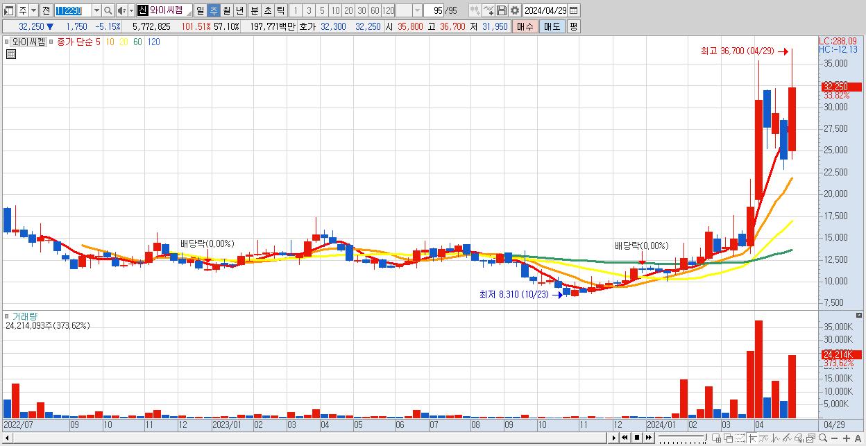 - 와이씨켐 (32,250원 ▲ 33.82% , 시총: 3,261억, 거래량: 24,214,093, 거래대금:7,495억)