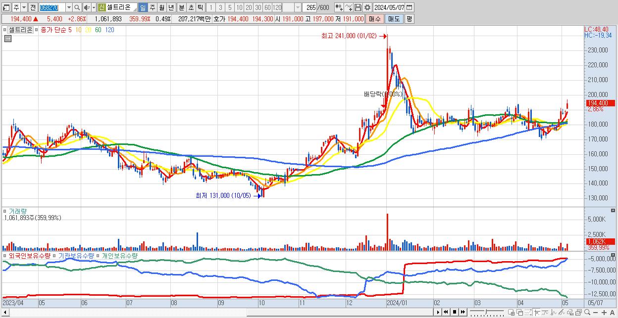 - 셀트리온 (194,400원 ▲ 2.86% , 시총: 423,889억, 외국인 순매수 거래금:201억)