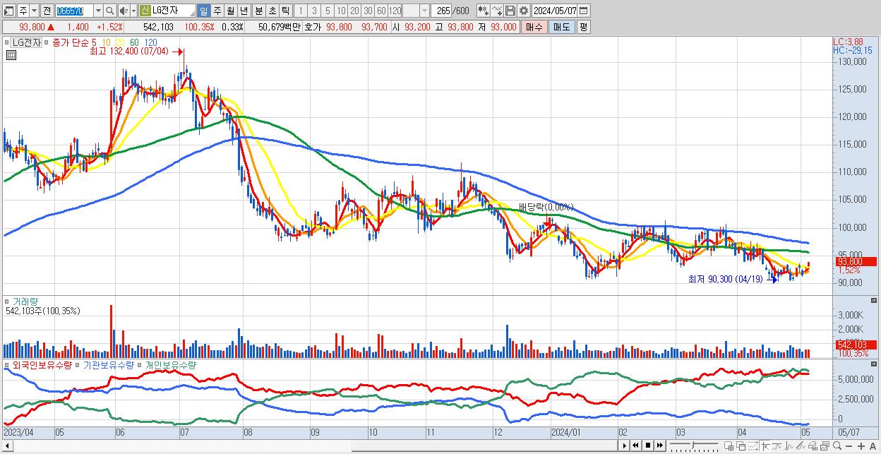 - LG전자 (93,800원 ▲ 1.52% , 시총: 153,502억, 외국인 순매수 거래금:90억)